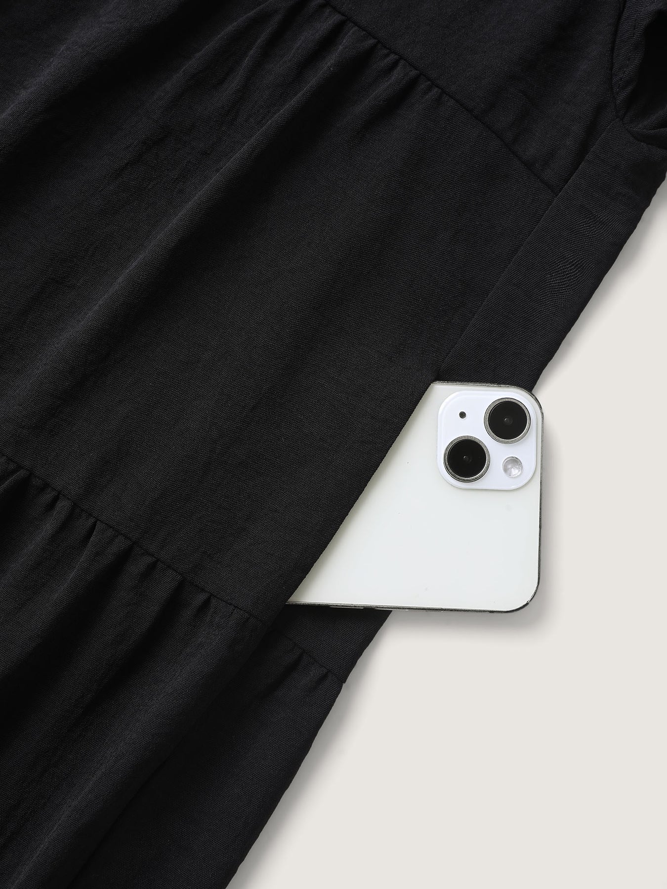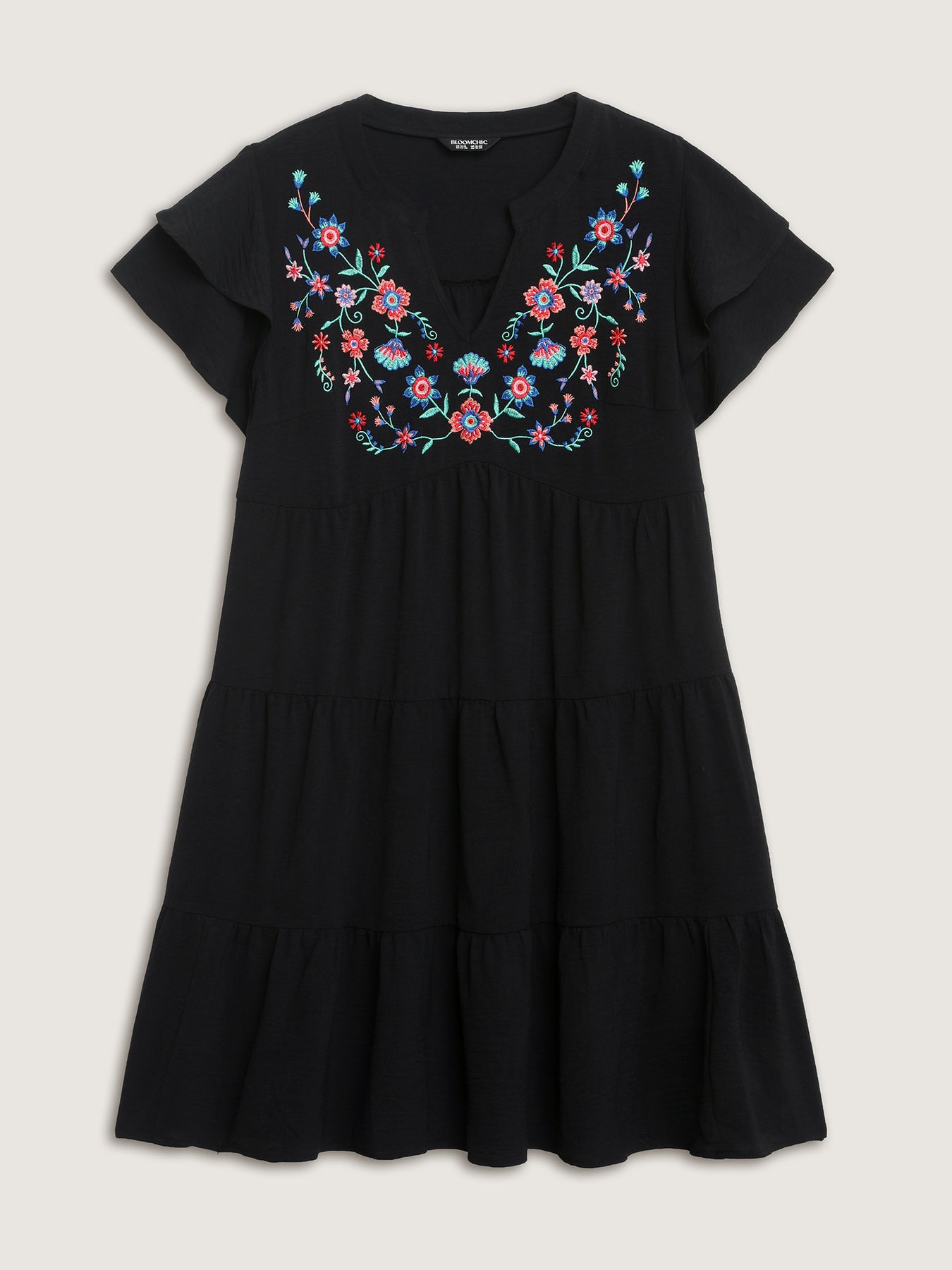 Embroidered Neckline A-Line Ruffled Knee-Length Dress