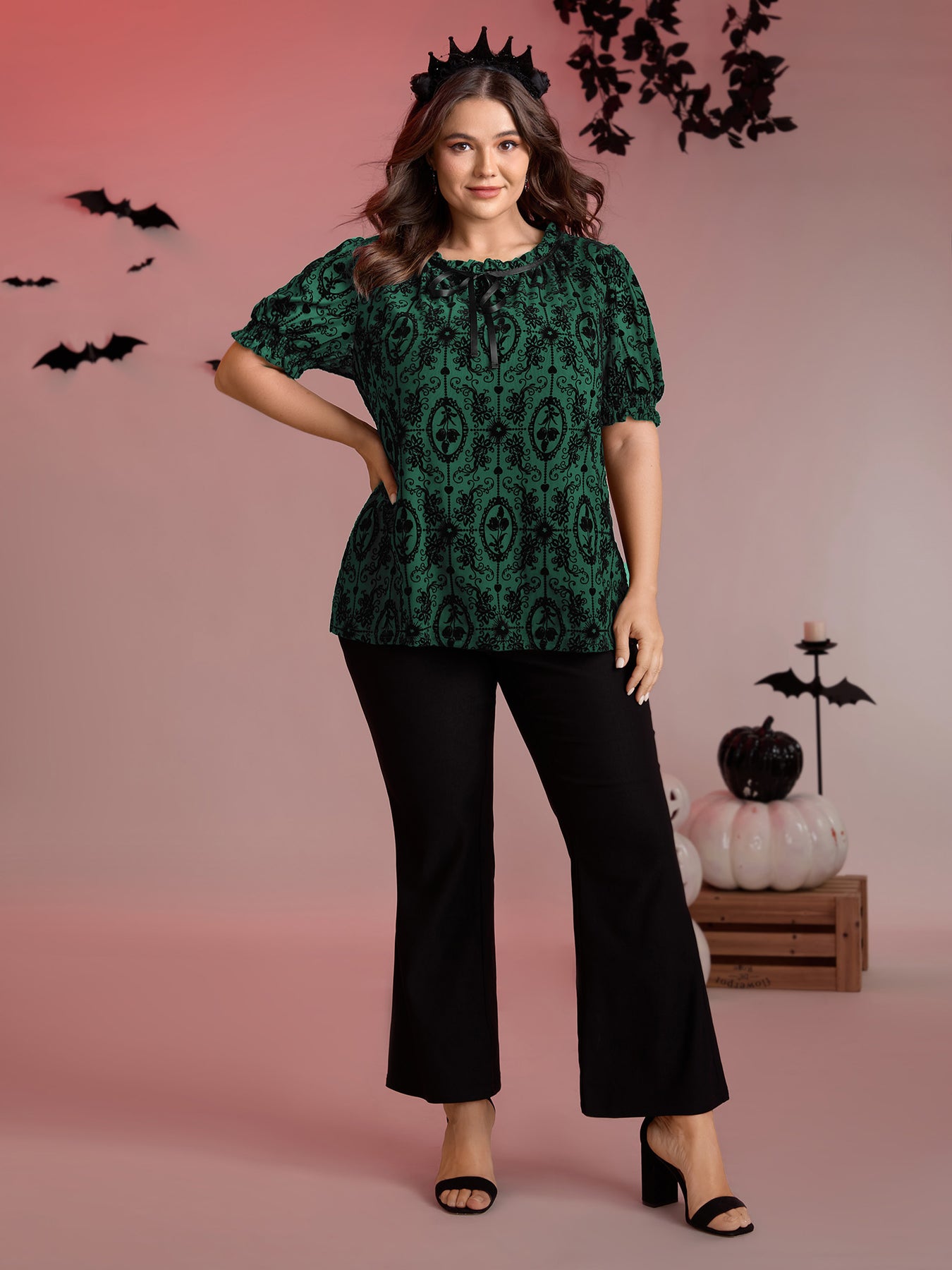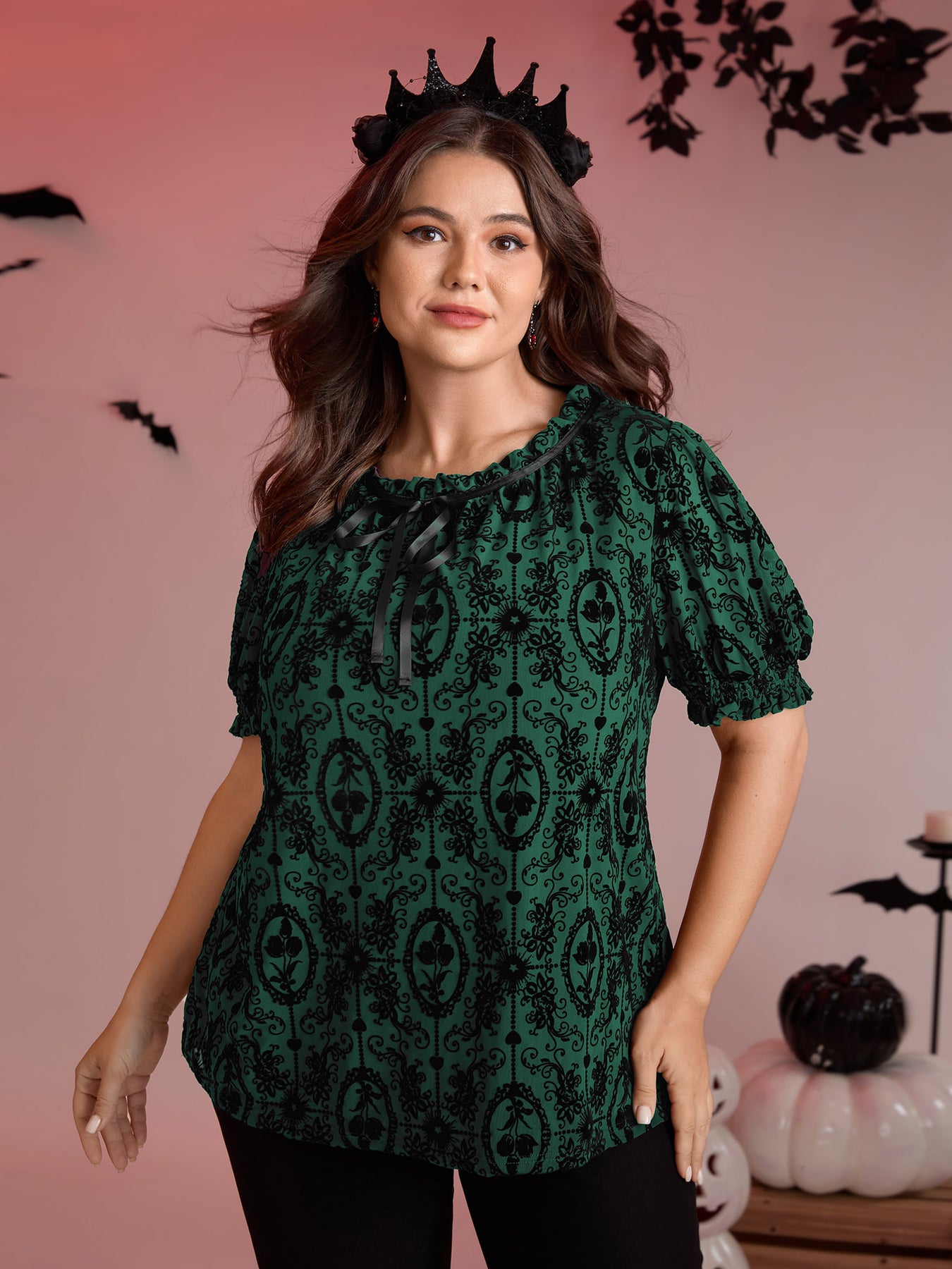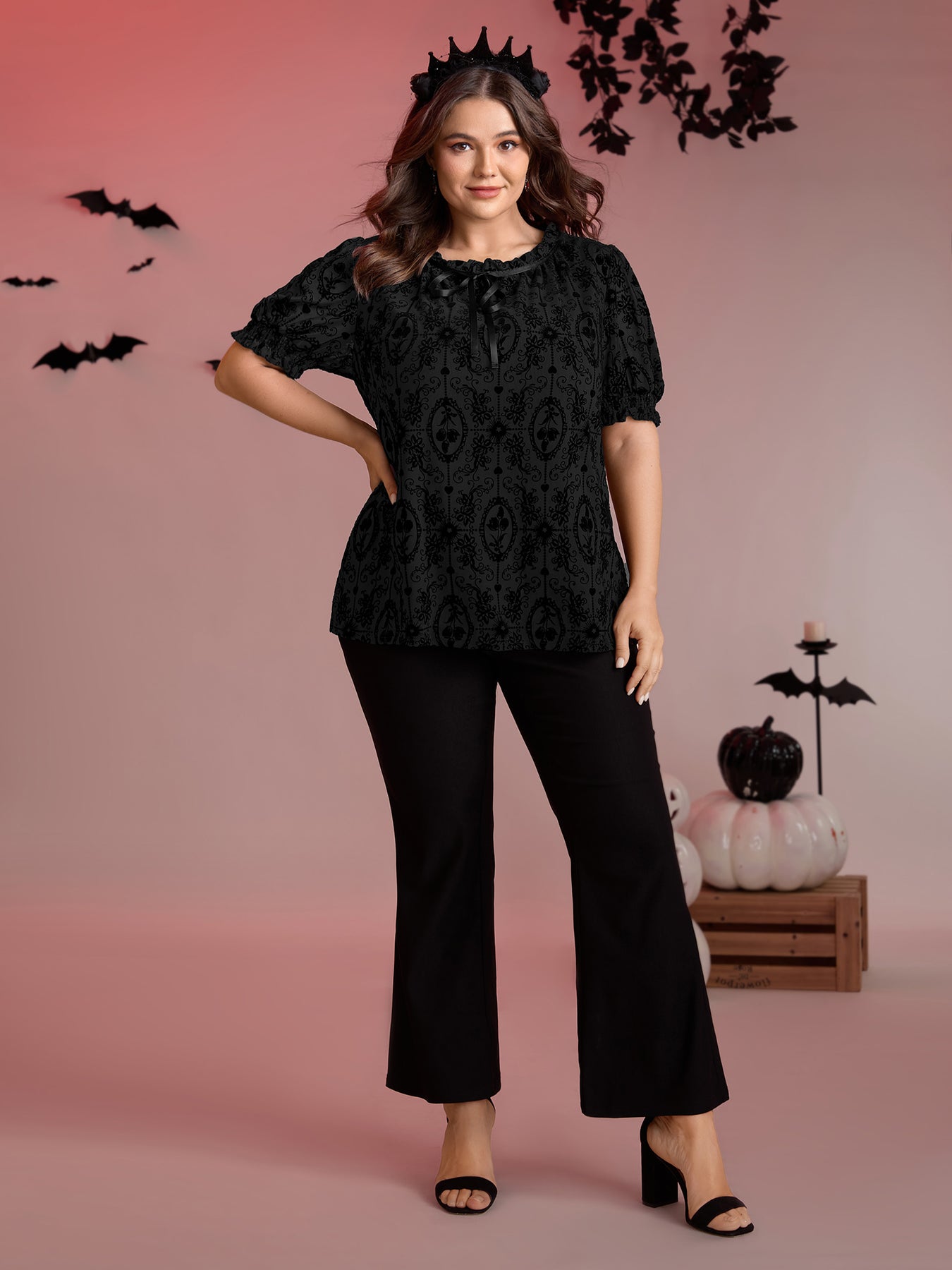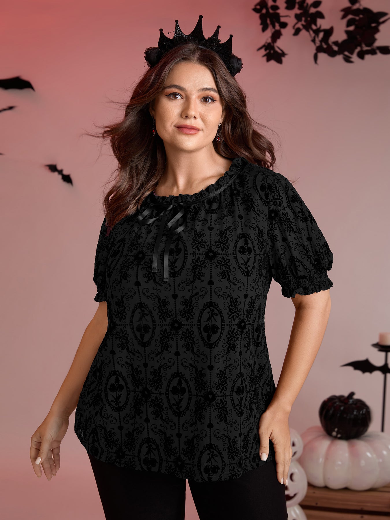 Flocked Texture Shirred Contrast Blouse