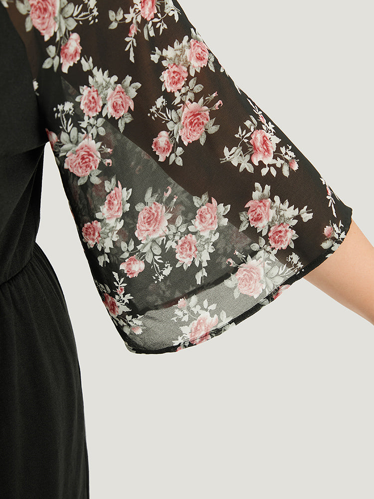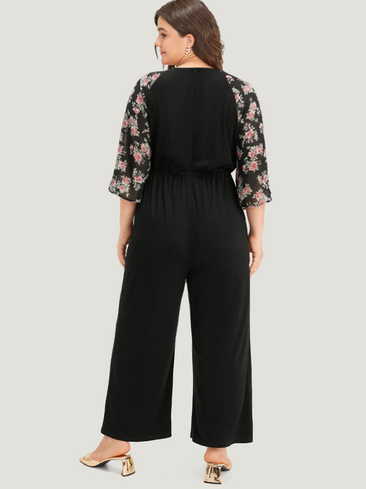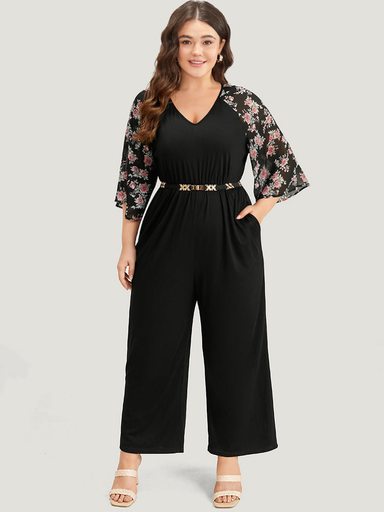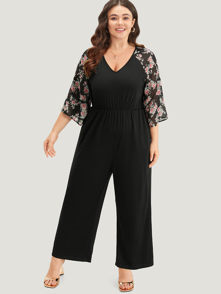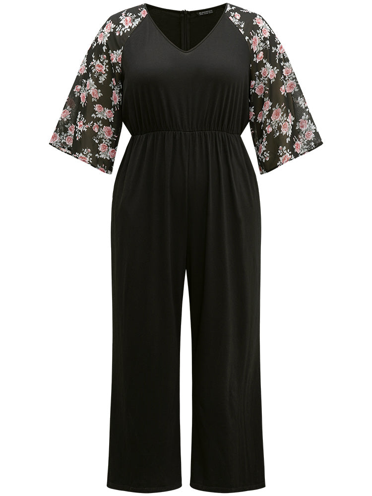 Floral Print Ruffles V Neck Raglan Sleeve Jumpsuit