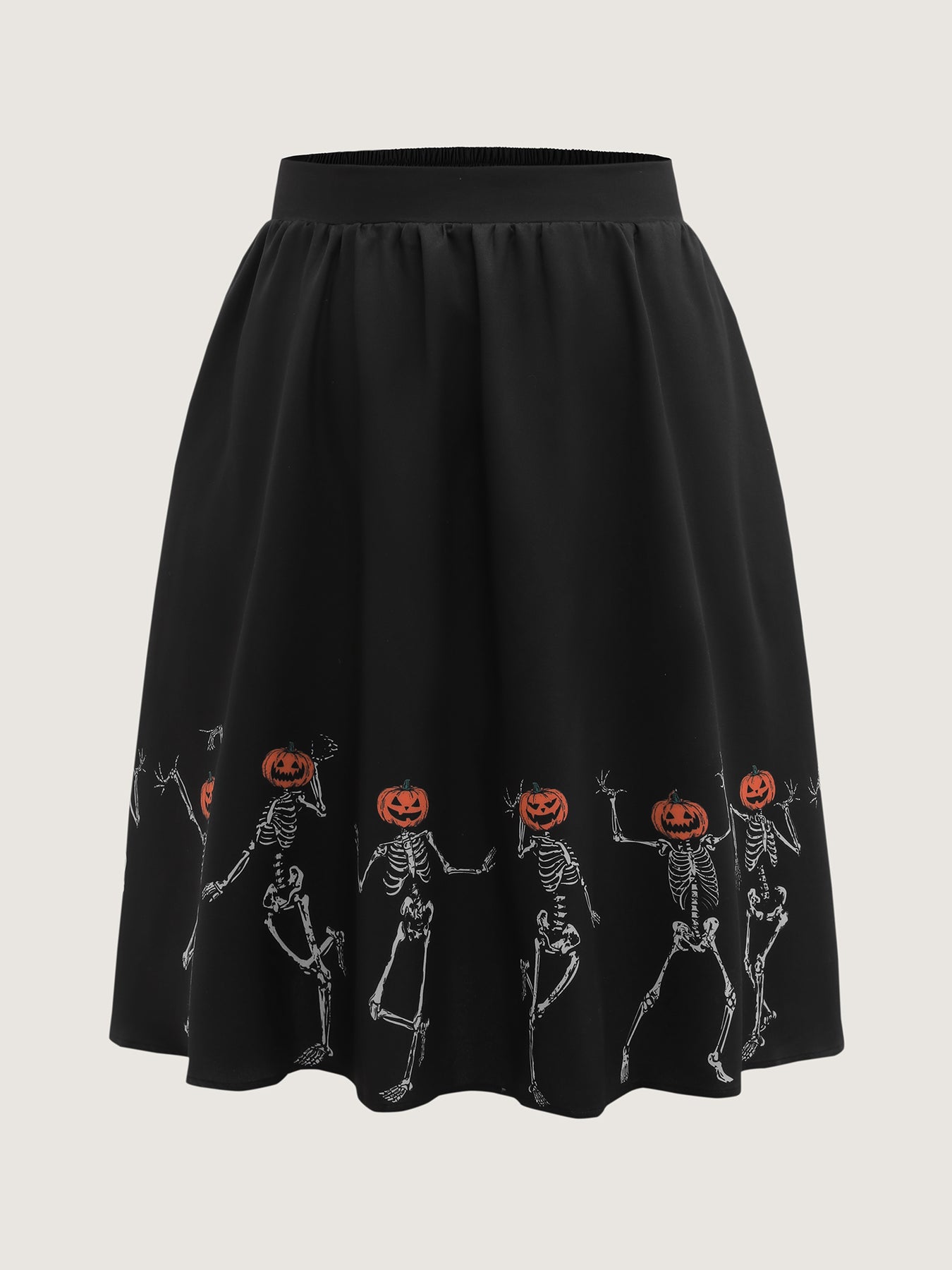 Pumpkin Head Skeleton Print Flared Midi Dress