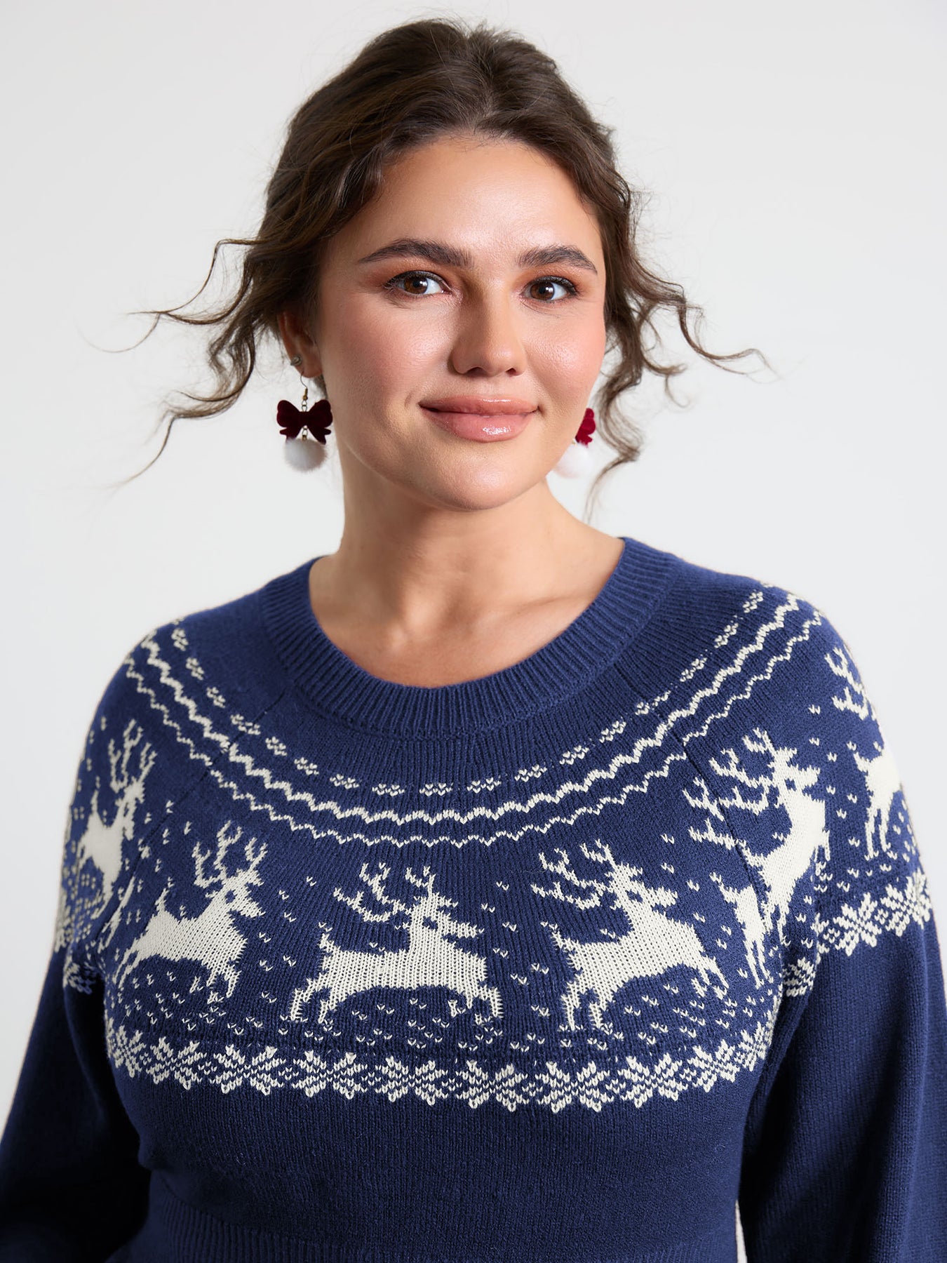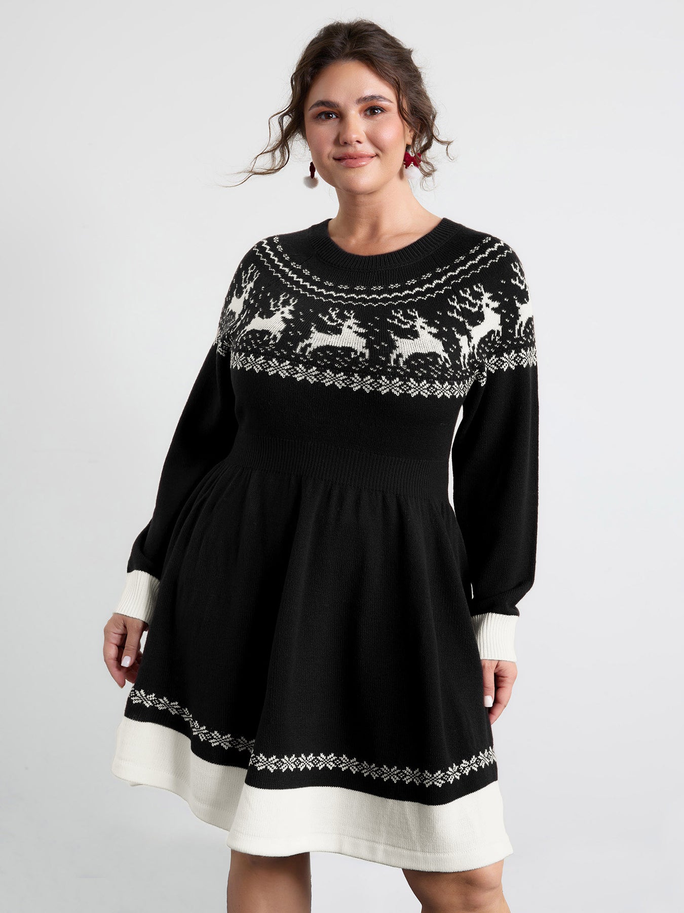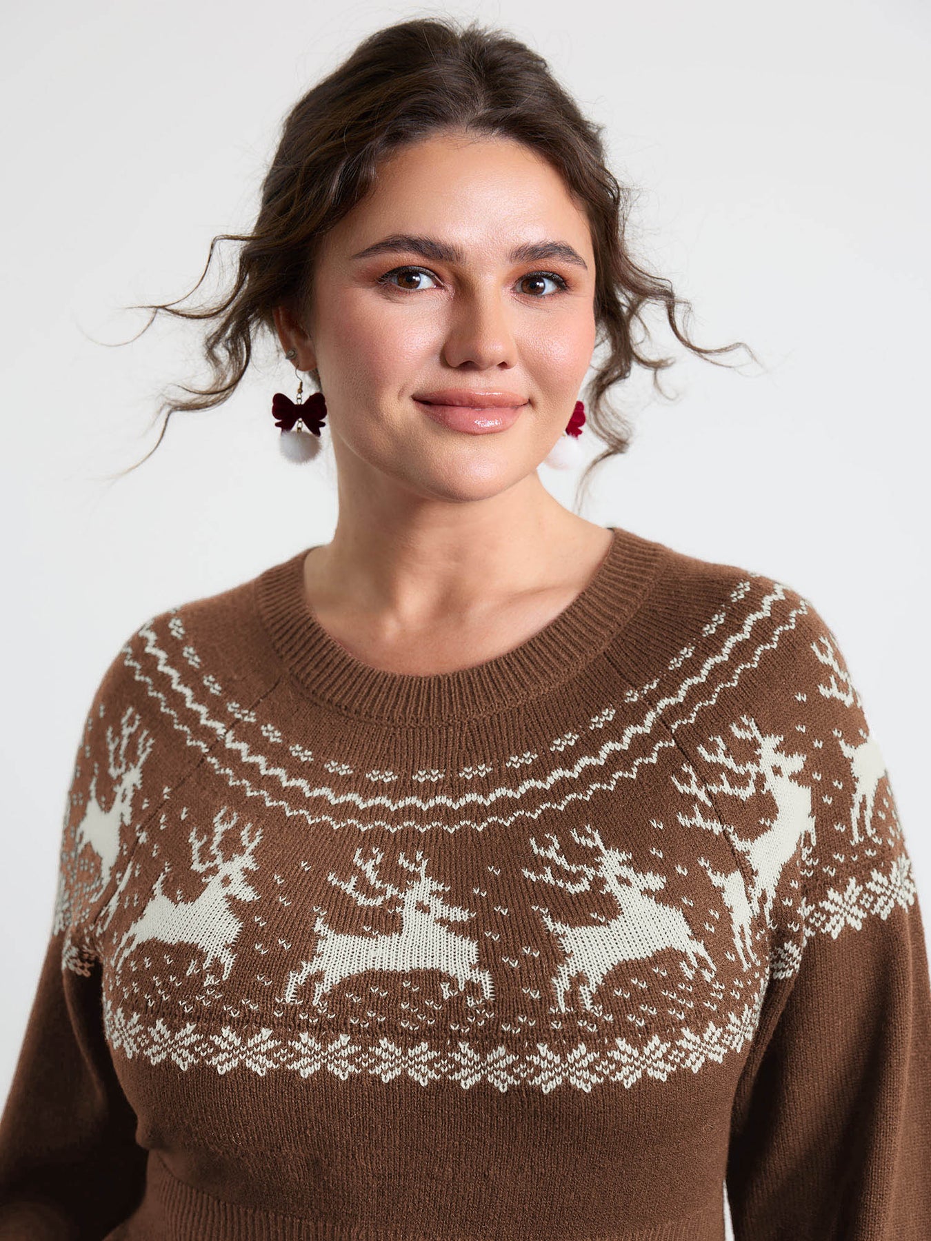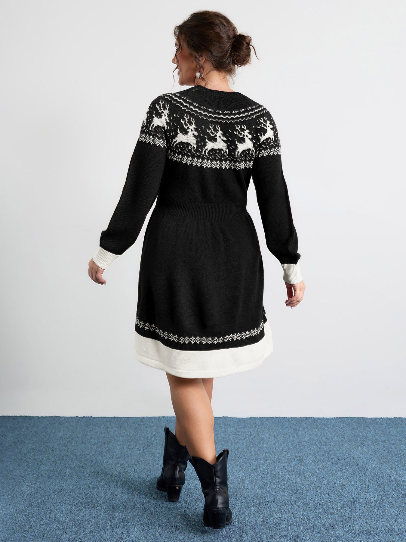 Reindeer Print Cinched-Waist Sweater Midi Dress
