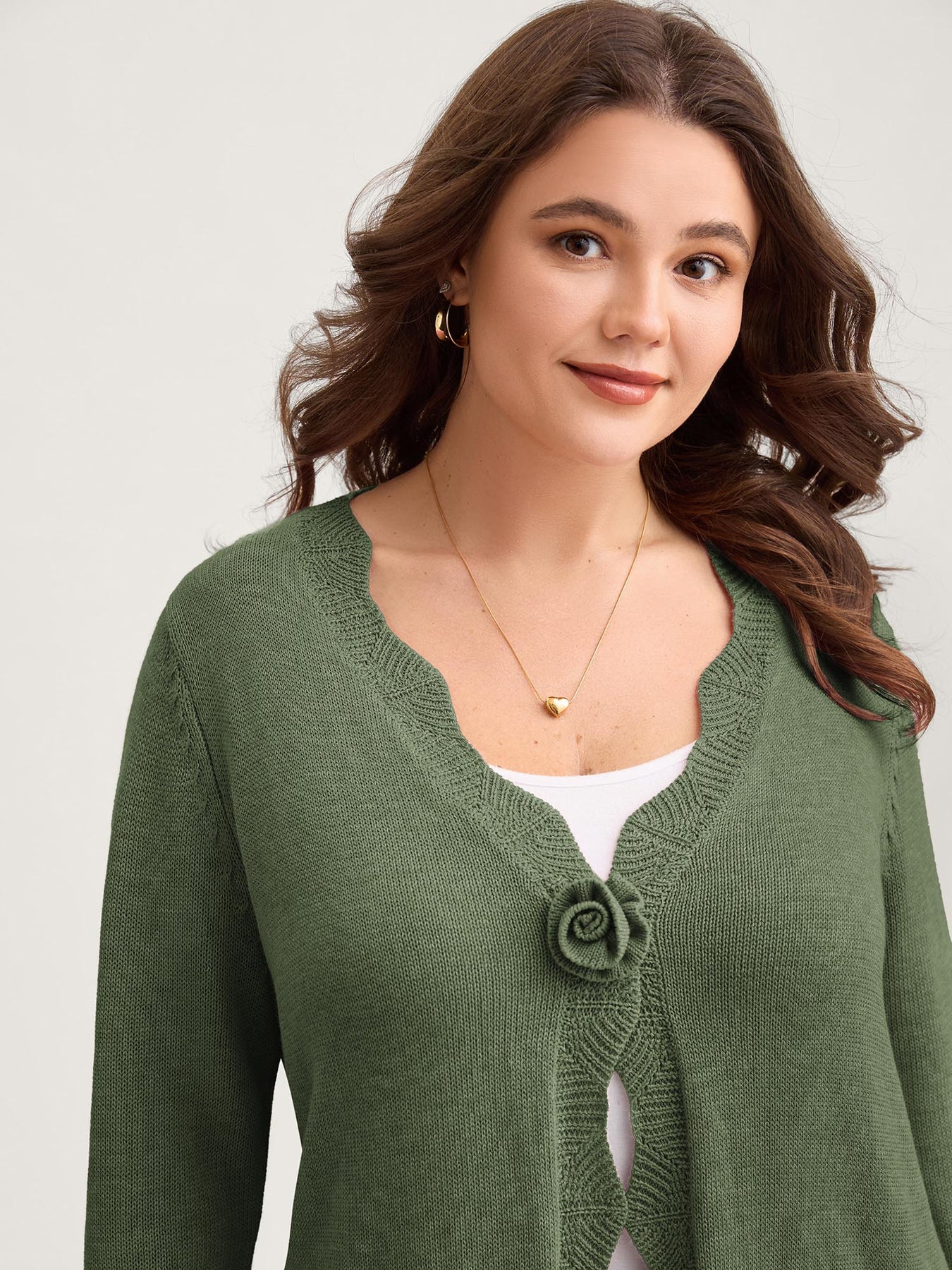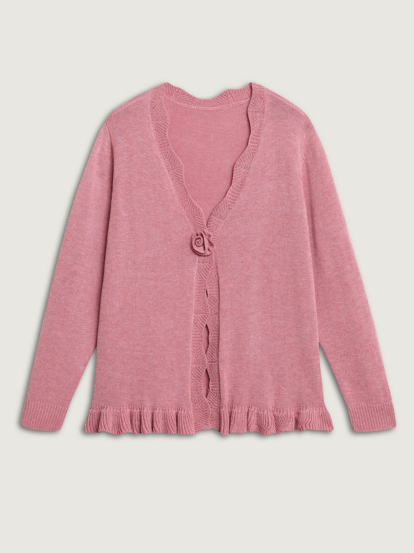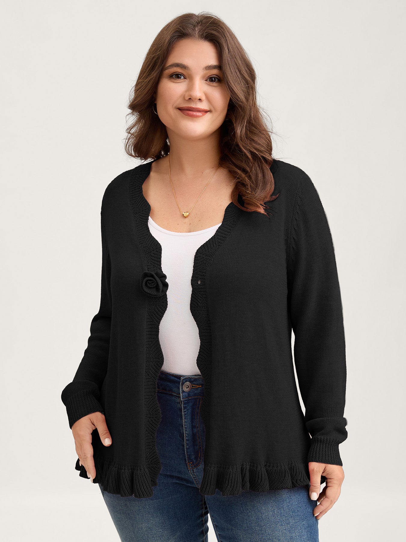 Supersoft Textured Floral Button Ruffled Hem Knit Cardigan