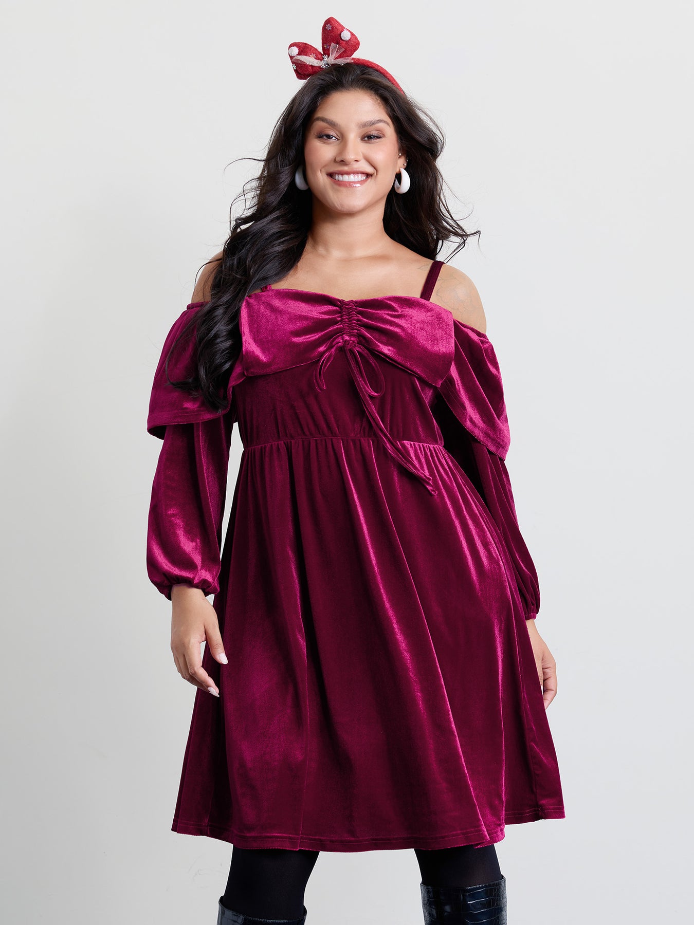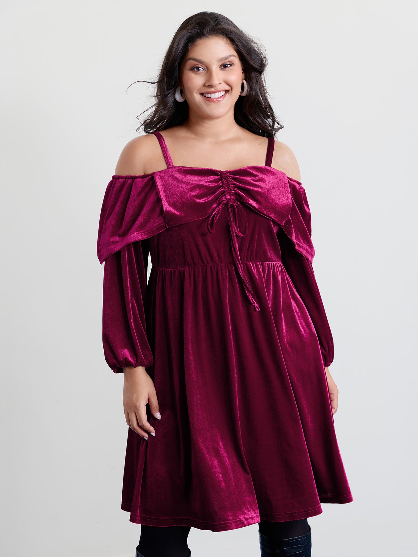 Velvet Off-Shoulder Bow Pockets Midi Dress