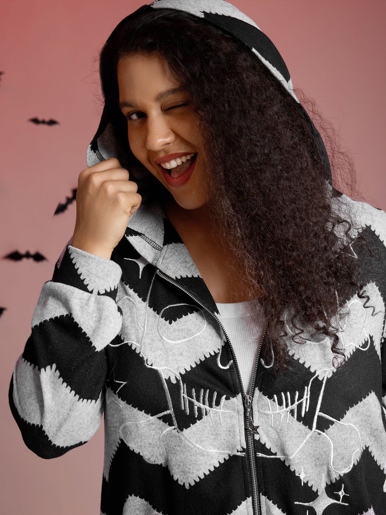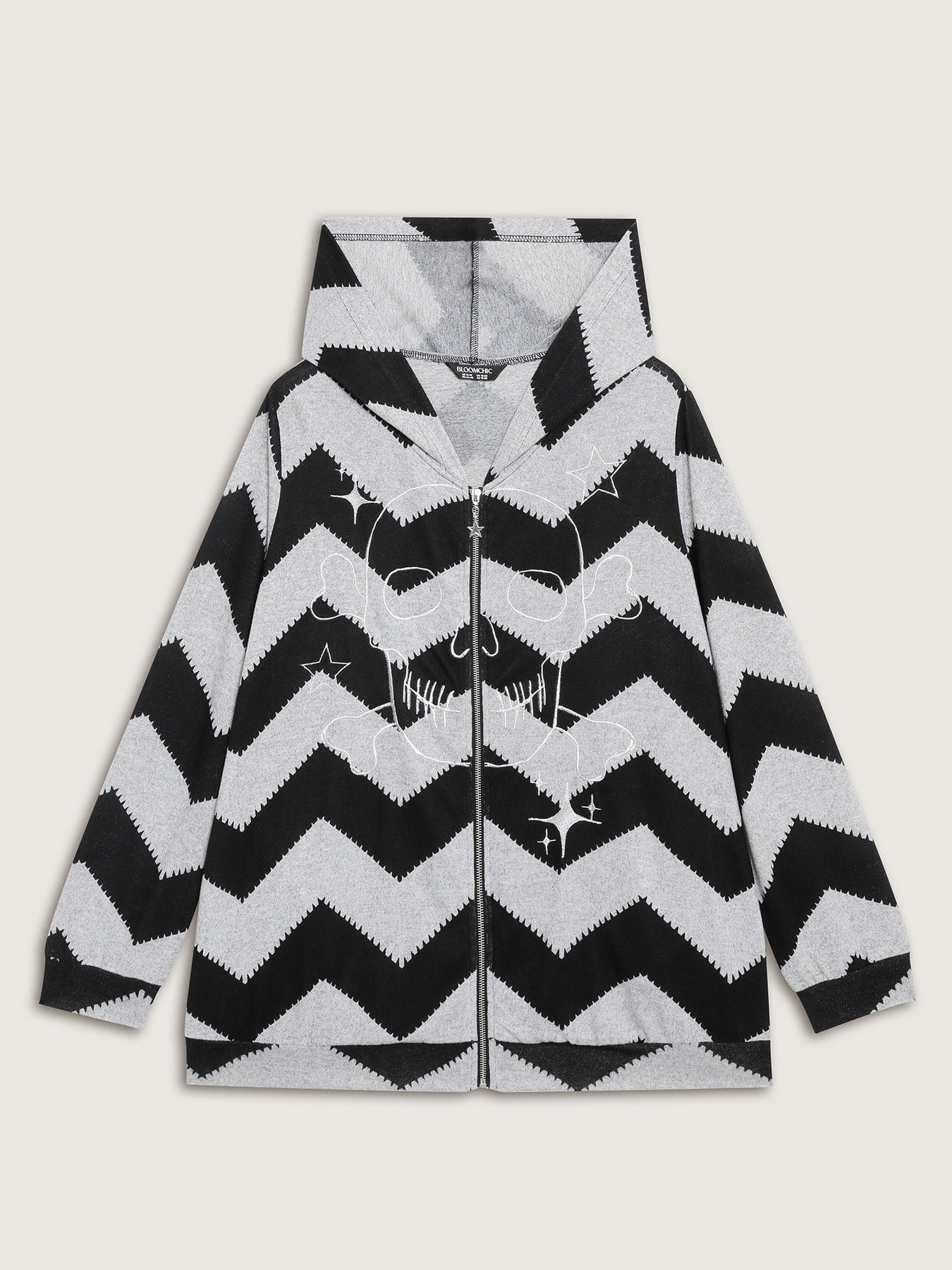 Wavy Stripe Skull Embroidery Zipper Hoodie